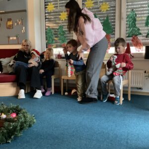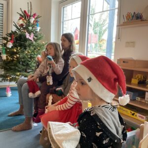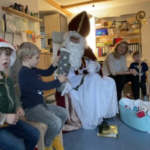 Zwischendurch sangen sie dem Nikolaus ihre eingeübten Lieder vor, und man konnte sehen, wie sehr ihn das freute. Und was hatte er noch mitgebracht? Die verschwundenen Socken! Liebevoll gefüllt, einzeln wurden sie vom Nikolaus an die Kinder verteilt.