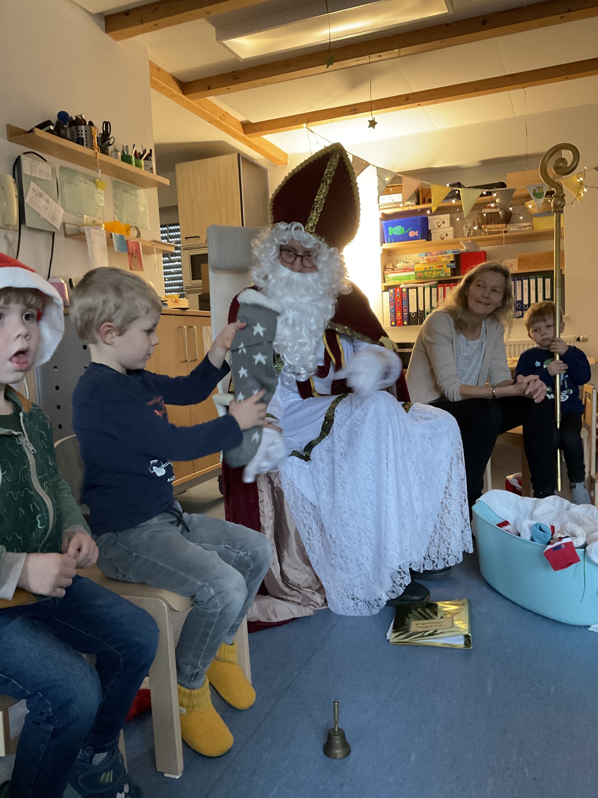 Zwischendurch sangen sie dem Nikolaus ihre eingeübten Lieder vor, und man konnte sehen, wie sehr ihn das freute. Und was hatte er noch mitgebracht? Die verschwundenen Socken! Liebevoll gefüllt, einzeln wurden sie vom Nikolaus an die Kinder verteilt.